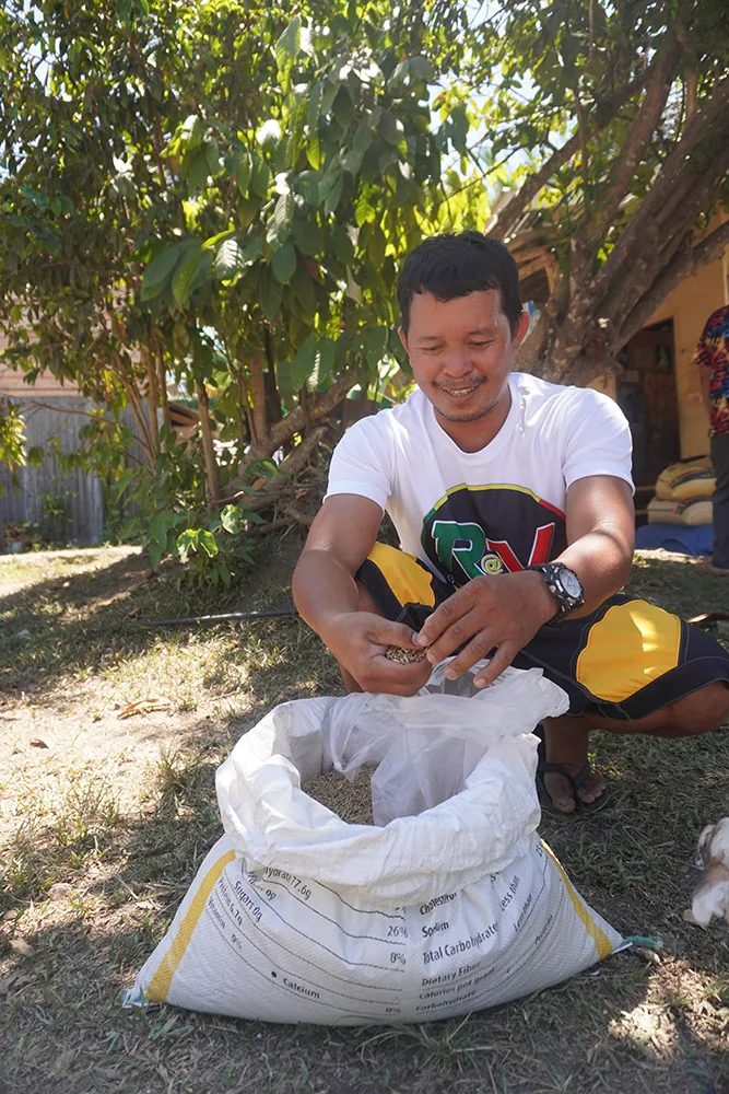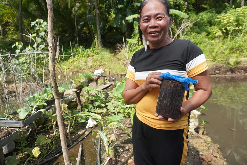 The Low External Input and Sustainable Agriculture (LEISA) approach includes an odourless method of raising pigs. The method uses natural and readily available materials such as rice hulls and saw-dust as bedding for the pigs in their pens. This material not only reduces odours, but also creates less stress for the pigs than chemical beds and uses less water. One farmer, Oliva, said, “Since we’ve applied [this method] it did not stink, and we only get to bathe our pigs once a week.” Oliva also feeds her pigs organic food. “Because they are comfortable with even the enclosed structure and the kind of food they eat, we noticed that our pigs do not squeal all the time.” Oliva believes the pigs are less stressed by eating locally-grown organic food, as commercial feeds tended to dehydrate them.
